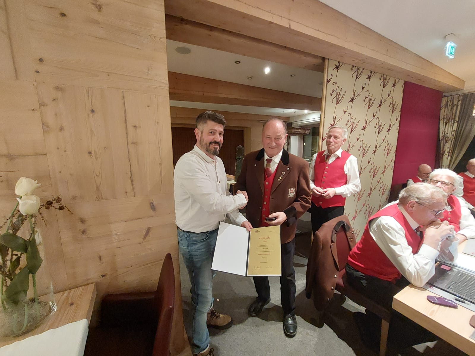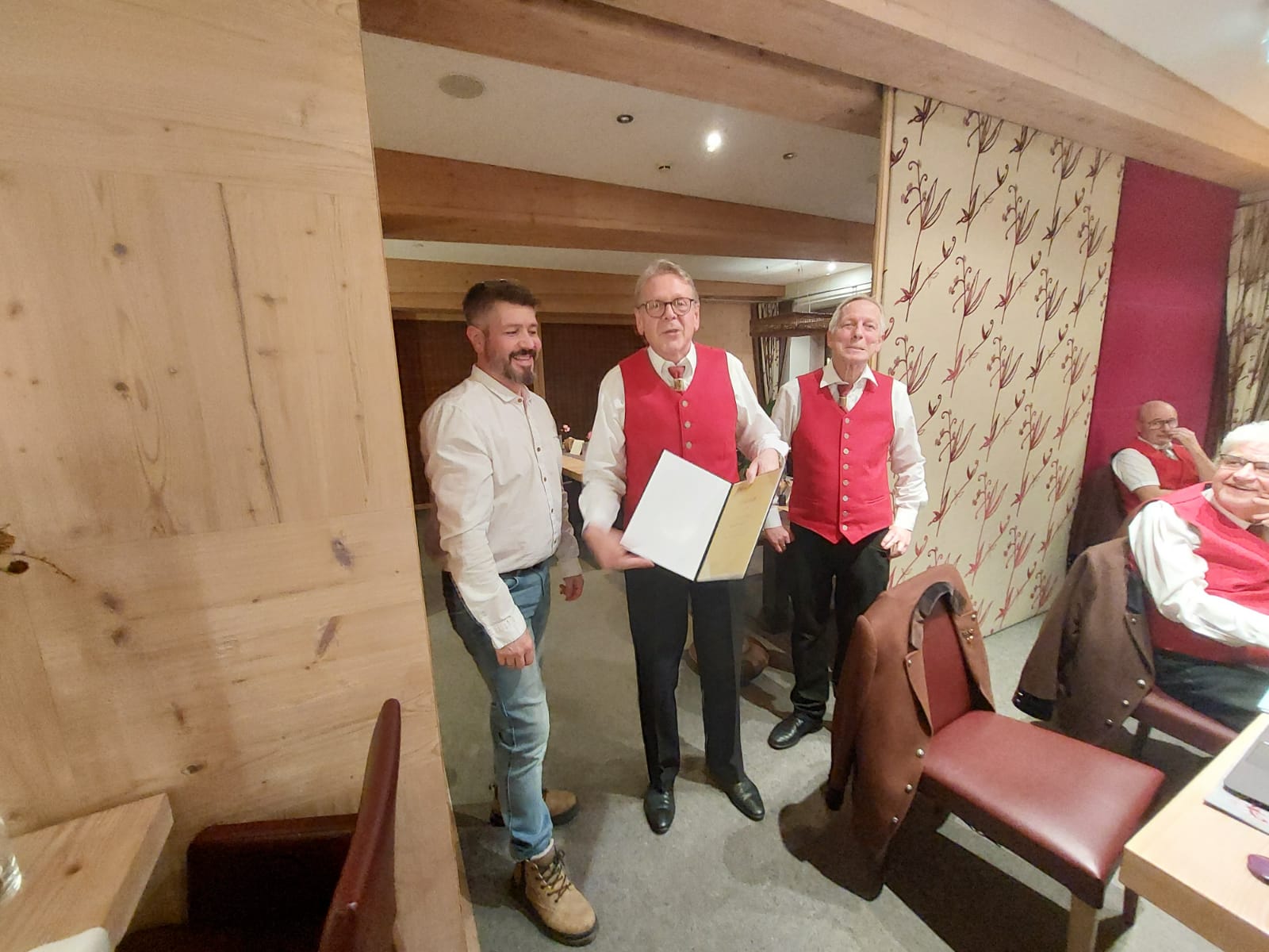 Raimund Oblasser erhielt für 40-jährige Mitgliedschaft beim MGV Reutte das Ehrenzeichen in Gold mit Urkunde von Obmann Thomas Sturm und Vizebgm. Markus Immler überreicht.