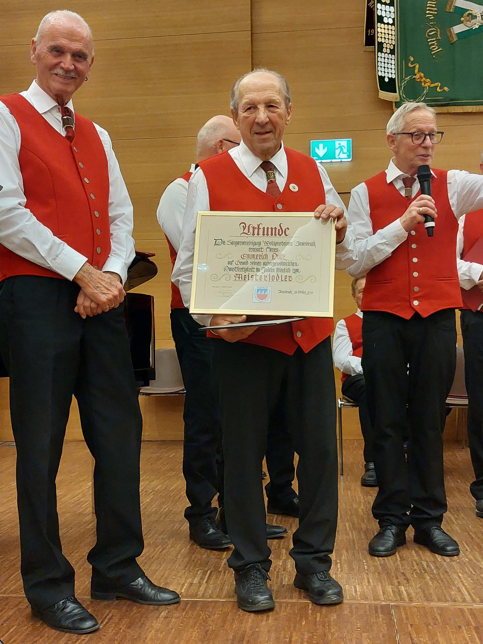Aus der Hand von Emanuel Dallapozza von der Sängervereinigung Wolkensteiner aus Innsbruck erhielt Emmi die Auszeichnung zum Meisterjodler.